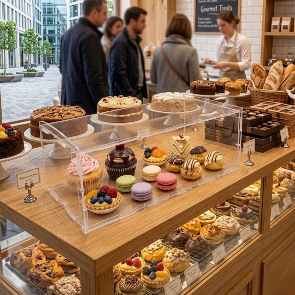 This acrylic bakery display case is perfect for bakeries, cafés, coffee shops, restaurants, and retail counters. It is ideal for displaying cakes, pastries, donuts, cupcakes, sandwiches, and sweets while keeping them protected and easy to view. It can also be used for non-food items such as handmade goods, cosmetics, and small electronics, making it a versatile choice for both food and retail displays.