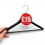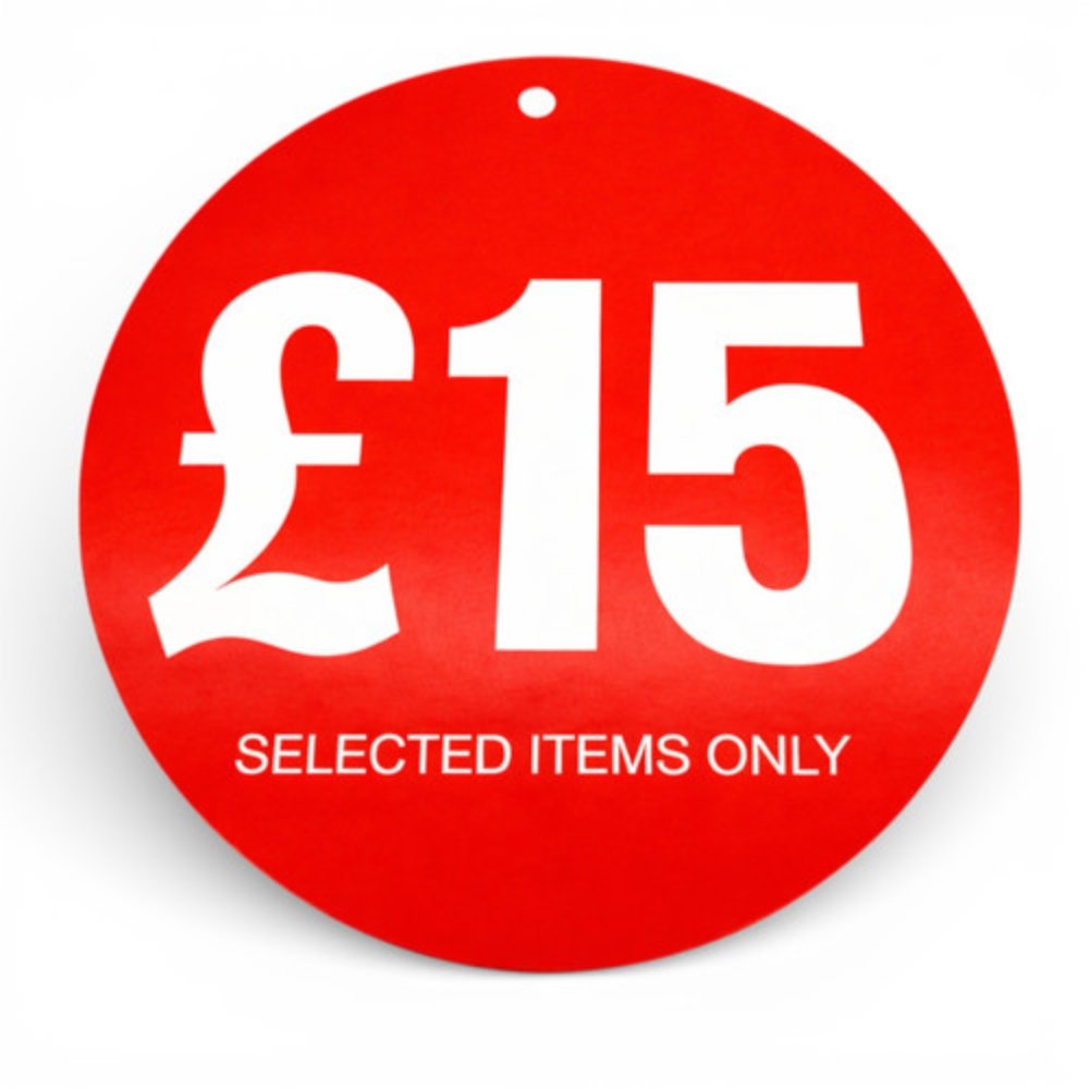 Perfect for clothing stores, boutiques, department stores, and clearance displays, these £15 Round Hanger Tickets sit neatly over coat hanger hooks to mark promotional items. The bold red colour and “£15 Selected Items Only” message make it easy for customers to identify sale products, improving visibility, simplifying promotions, and encouraging purchases.