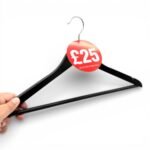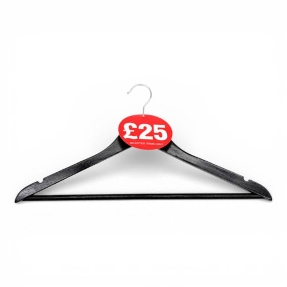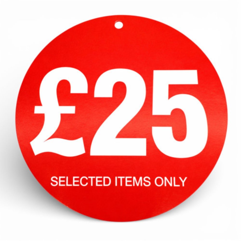 Perfect for clothing stores, boutiques, department stores, and clearance displays, these £25 Round Hanger Tickets sit neatly over coat hanger hooks to mark promotional items. The bold red colour and “£25 Selected Items Only” message make it easy for customers to identify discounted products, improving visibility, simplifying promotions, and encouraging sales.