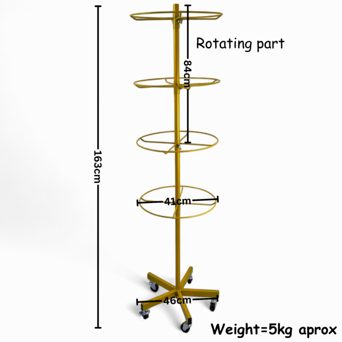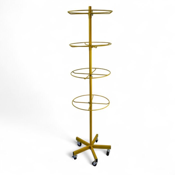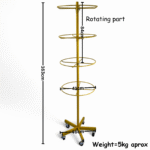 The 4-Tier Rotating Golden Metal Display Rack is a durable, space-saving retail fixture for small apparel and accessories. Built with a sturdy metal frame and a smooth 360° rotating base, it offers full product visibility from all angles. Its detachable vertical design enables easy assembly, transport, and storage, making it ideal for dynamic retail environments. The glossy metallic gold finish adds a premium aesthetic suitable for boutiques, malls, and showrooms.