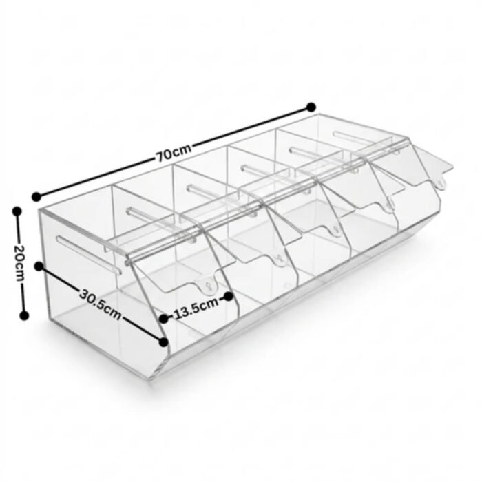Display a wide range of sweets in an organised and professional way with this 5 section acrylic pick and mix sweet dispenser. Made from strong clear acrylic, it provides excellent durability while allowing customers to clearly see products, helping to increase impulse purchases.
