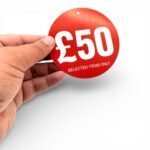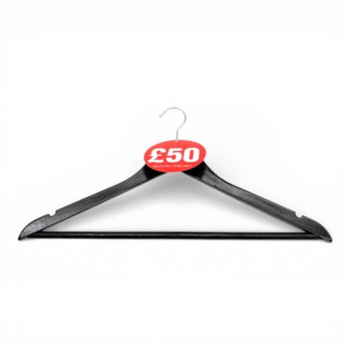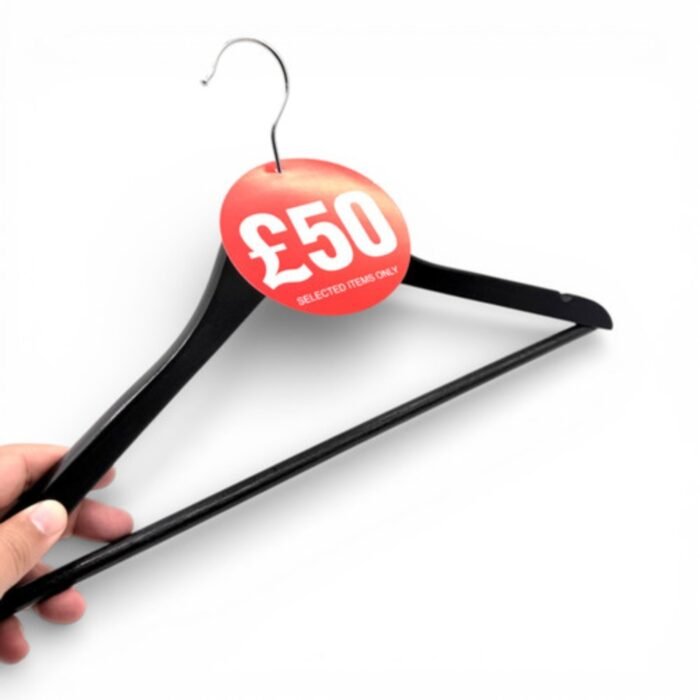 Perfect for clothing stores, boutiques, department stores, and clearance displays, these £50 Round Hanger Tickets sit neatly over coat hanger hooks to mark promotional items. The bright red colour and “£50 Selected Items Only” message help customers quickly spot discounted products, improving visibility, simplifying promotions, and encouraging purchases.