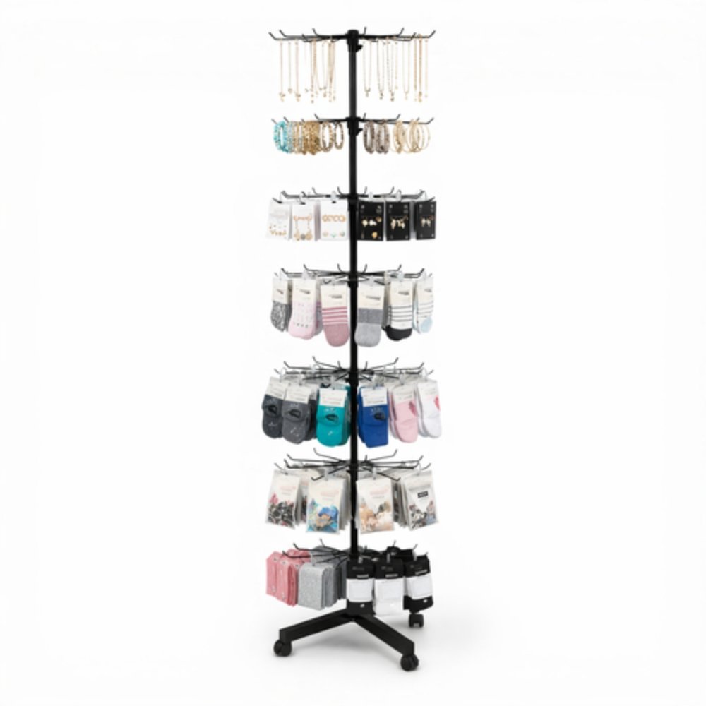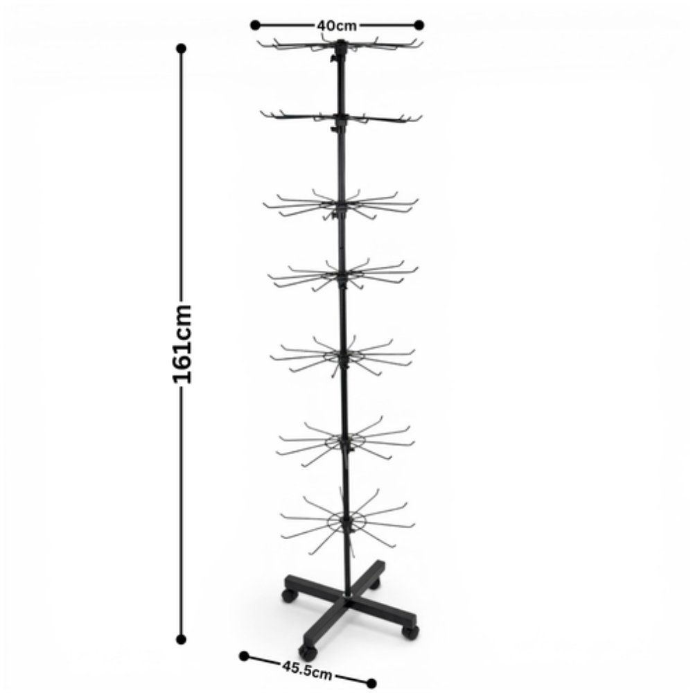 Organise and display your products neatly with this rotating retail display rack. Made from strong iron with a black rust-resistant finish, it is designed for everyday use in busy retail environments. The 7 adjustable tiers and 70 hooks give you plenty of space to display different items while keeping everything easy to access.