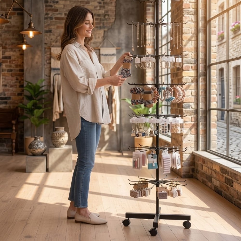 This rotating retail display rack is ideal for shops, exhibitions, craft fairs, and market stalls. It is perfect for displaying jewellery, keychains, hats, socks, and accessories in an organised way. The rotating design makes browsing easy for customers, while the wheels allow you to move the stand wherever needed. It is also suitable for home use, helping to keep items neatly stored while saving space.