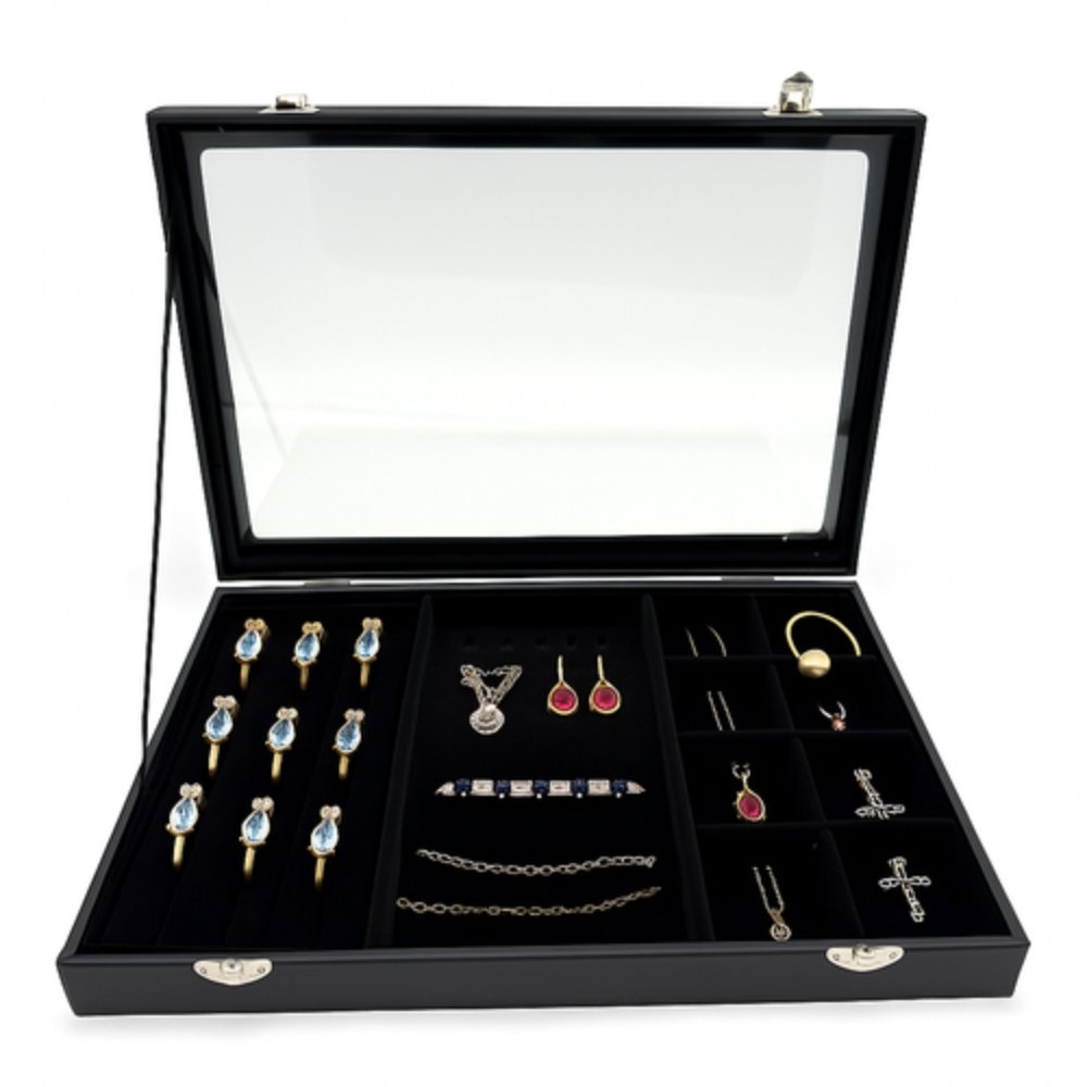 The sturdy wooden case is finished with a smooth leatherette covering for a clean, professional appearance. Inside, multiple compartment types provide dedicated space for chains, rings, and earrings, helping to prevent tangling, scratches, and damage.