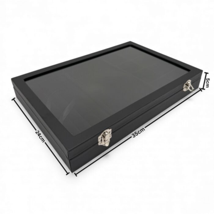 Keep your jewellery organised, protected, and easy to view with this black leatherette jewellery box featuring a clear glass lid. Designed for both storage and display, it keeps your accessories dust-free while allowing quick and easy selection.