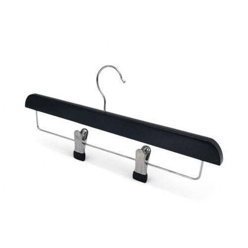 - Black wooden trouser skirt hanger with a sleek, modern finish