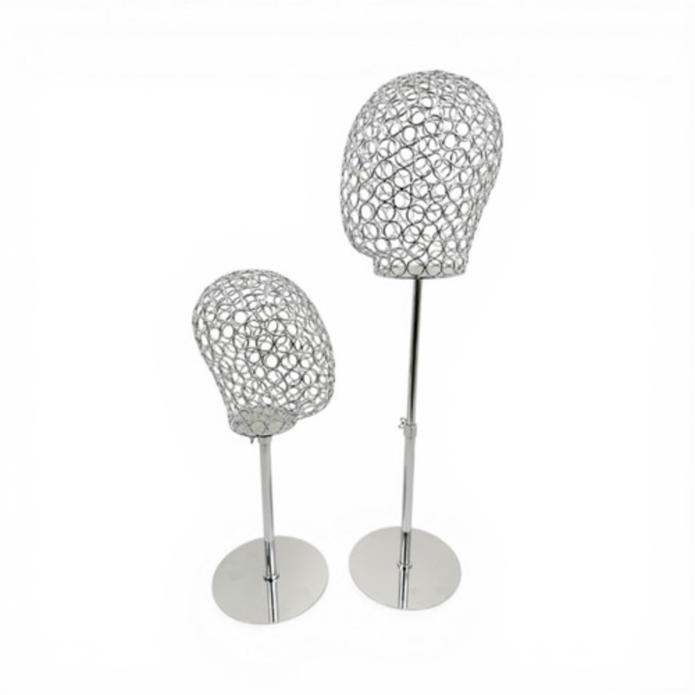 Display your hats, wigs, and headwear neatly with this mannequin head stand. Made from strong metal with a chrome finish, it offers a clean and modern look suitable for both retail and personal use. The ring wire head design helps maintain the natural shape of items while keeping them easy to access.