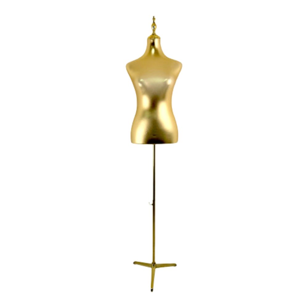 This Luxury Gold Female Torso is made from high-density polystyrene and covered with a gold stretch fabric outer surface featuring a metallic finish. The pinnable design allows easy fitting, draping, and garment adjustments, making it highly practical for fashion work and display use.