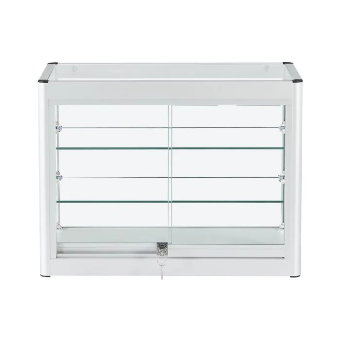 Showcase your products, valuables, or collectibles in style with the Premium Lockable Silver Aluminium Display Cabinet with LED Lighting. This sleek and modern display cabinet is crafted from durable silver aluminium, with a tempered glass countertop and 3 adjustable glass shelves that provide ample space for your display needs. The built-in LED lighting enhances visibility, making your items stand out in any setting.