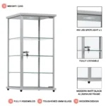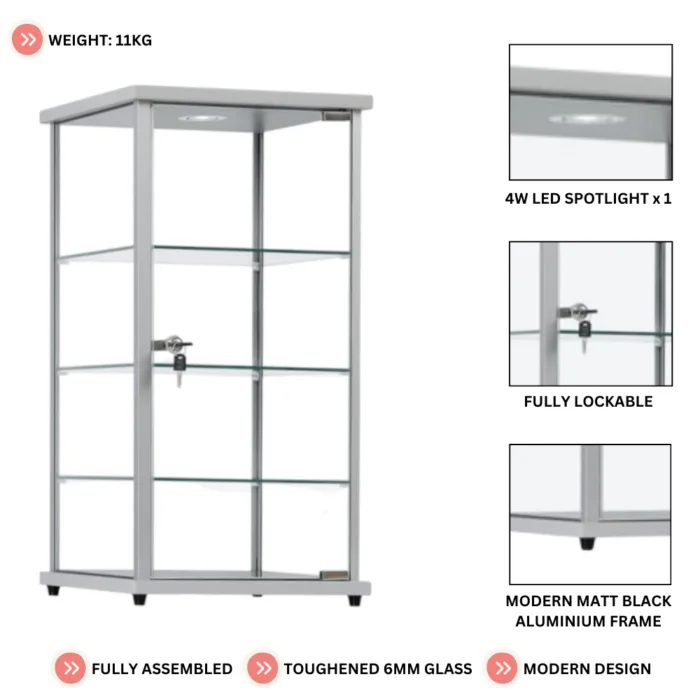 Premium Lockable Silver Aluminium Display Cabinet with LED Light | Glass Showcase Countertop & 3 Shelves for Retail and Home Display