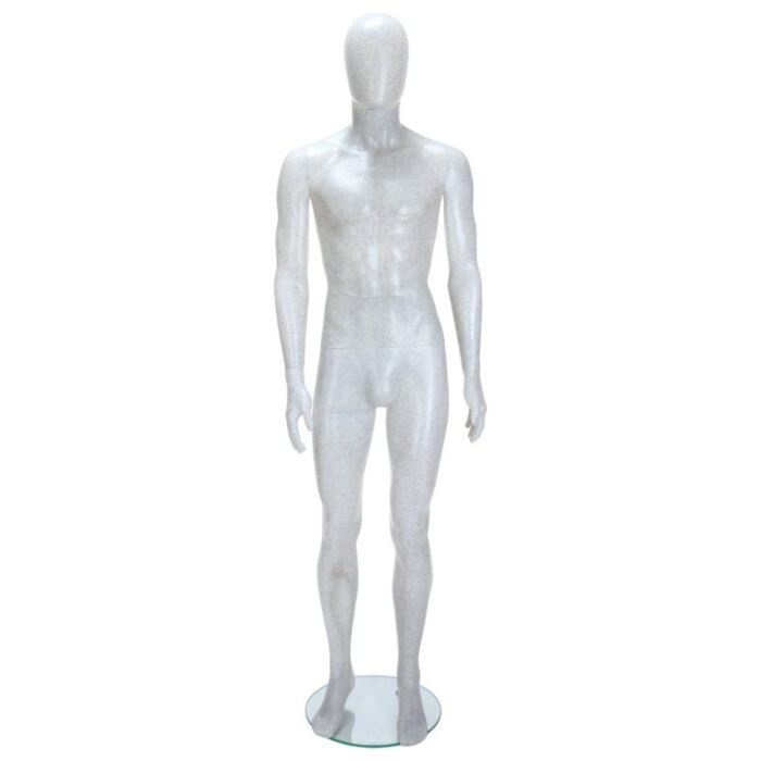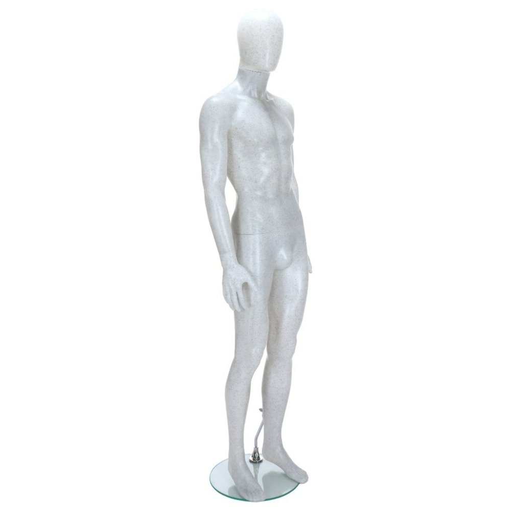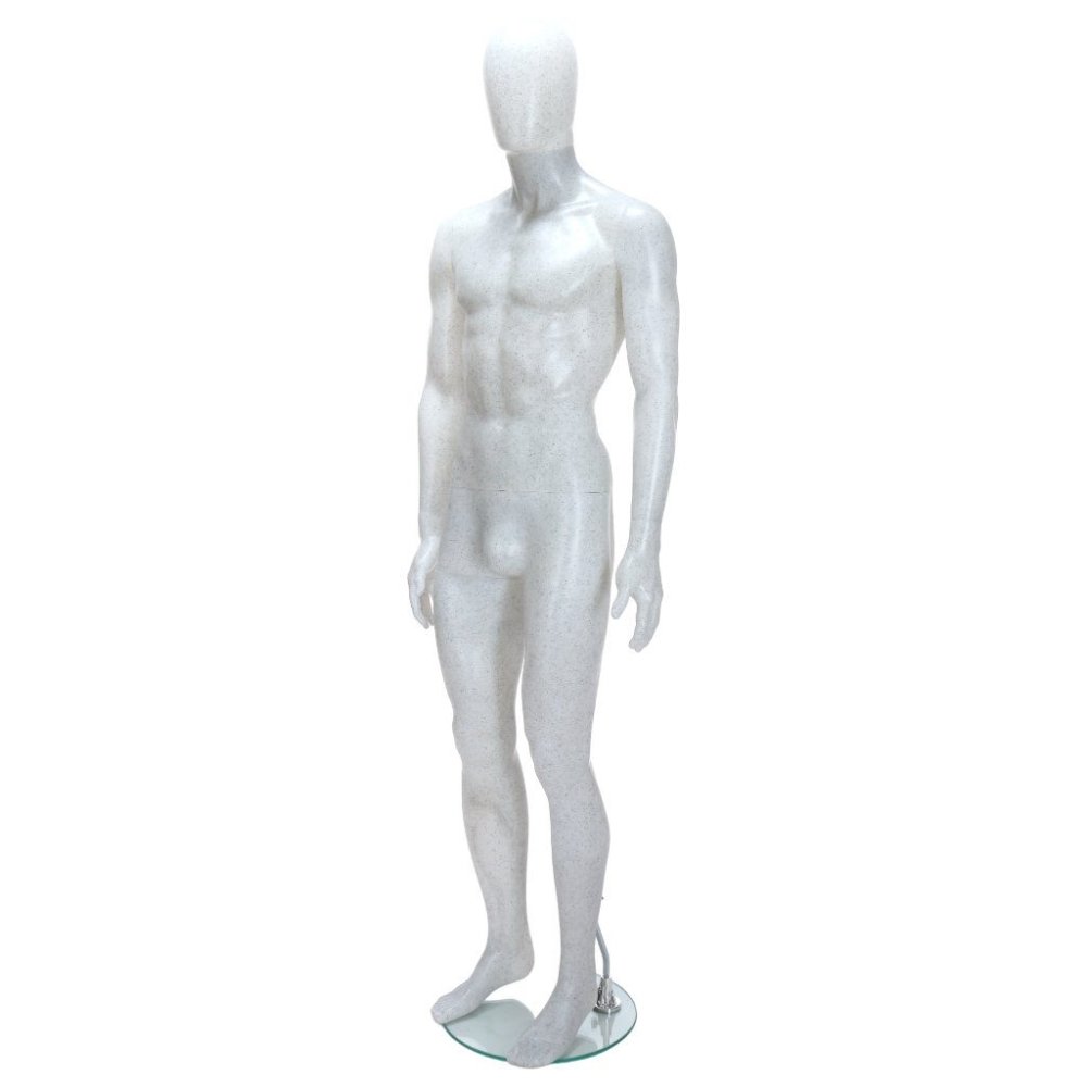 Create a modern and eye-catching retail display with the R346 Male Mannequin featuring a unique salt & pepper finish and egg head design. The white surface with black flecks gives this mannequin a distinctive look, helping your displays stand out in any retail environment.