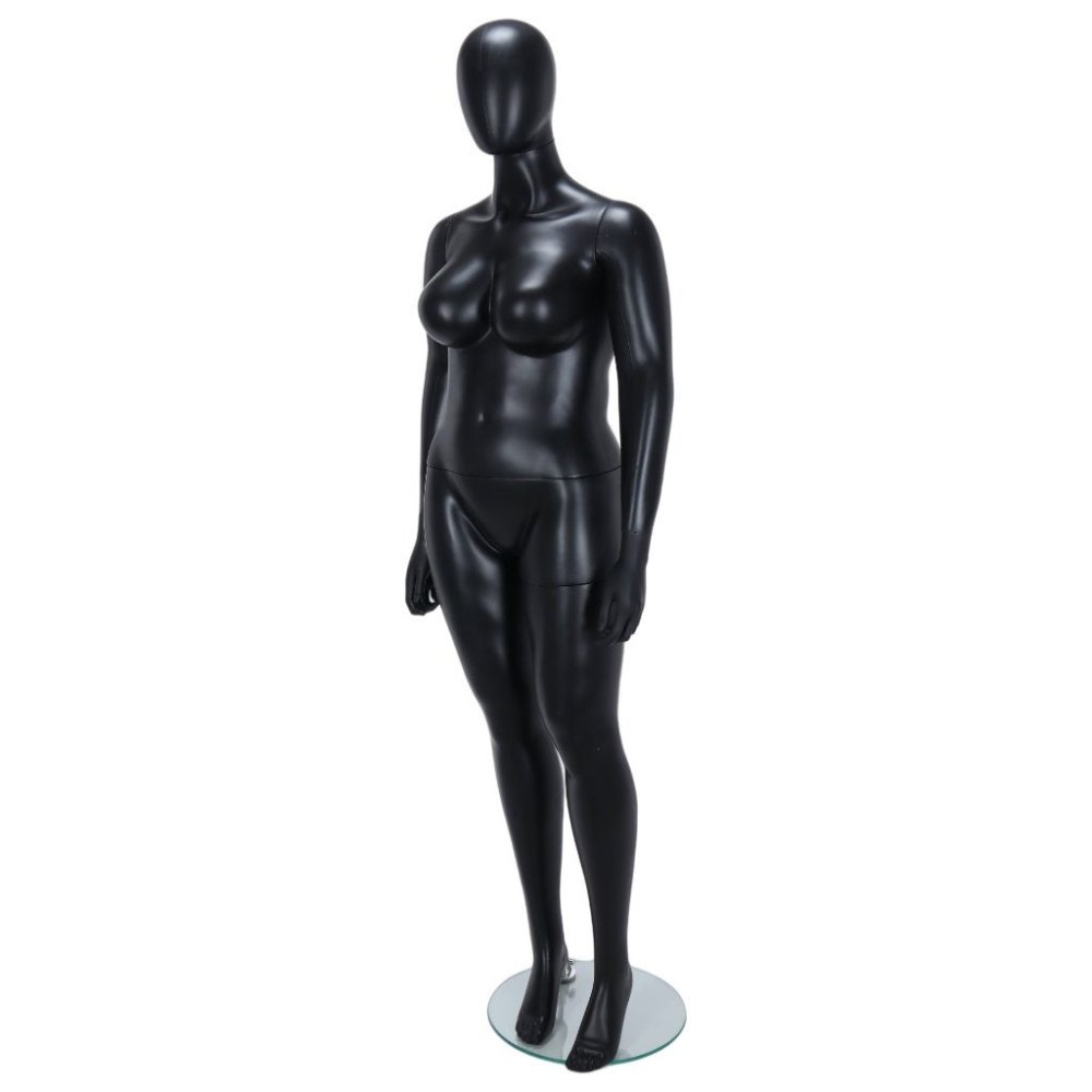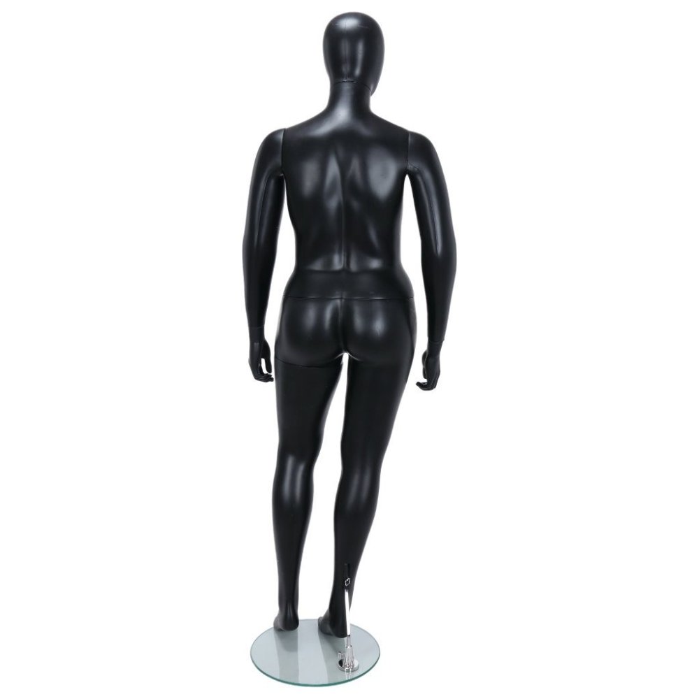 Showcase clothing, accessories, and footwear with style using the R349B Female Fuller Figure Mannequin. Designed with a fuller body and an egg head, this black finish mannequin offers lifelike proportions for professional retail or showroom displays.