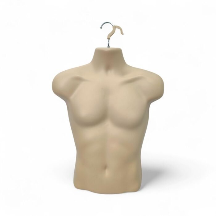 Showcase menswear with contemporary style using the 3/4 Skin Male Hanging Torso Form. Designed for boutiques, showrooms, and retail spaces with a minimalist aesthetic, this sleek mannequin is a durable and space-efficient solution for apparel display.